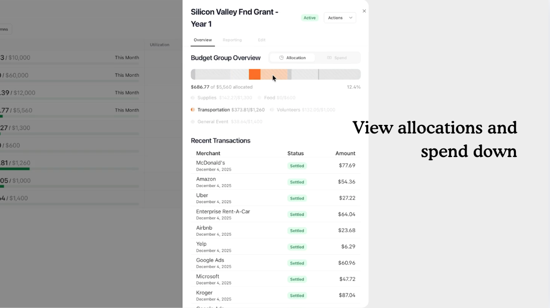 Allocate, track, and enforce spending rules for grants, programs, and departments, with real-time visibility into every dollar spent.